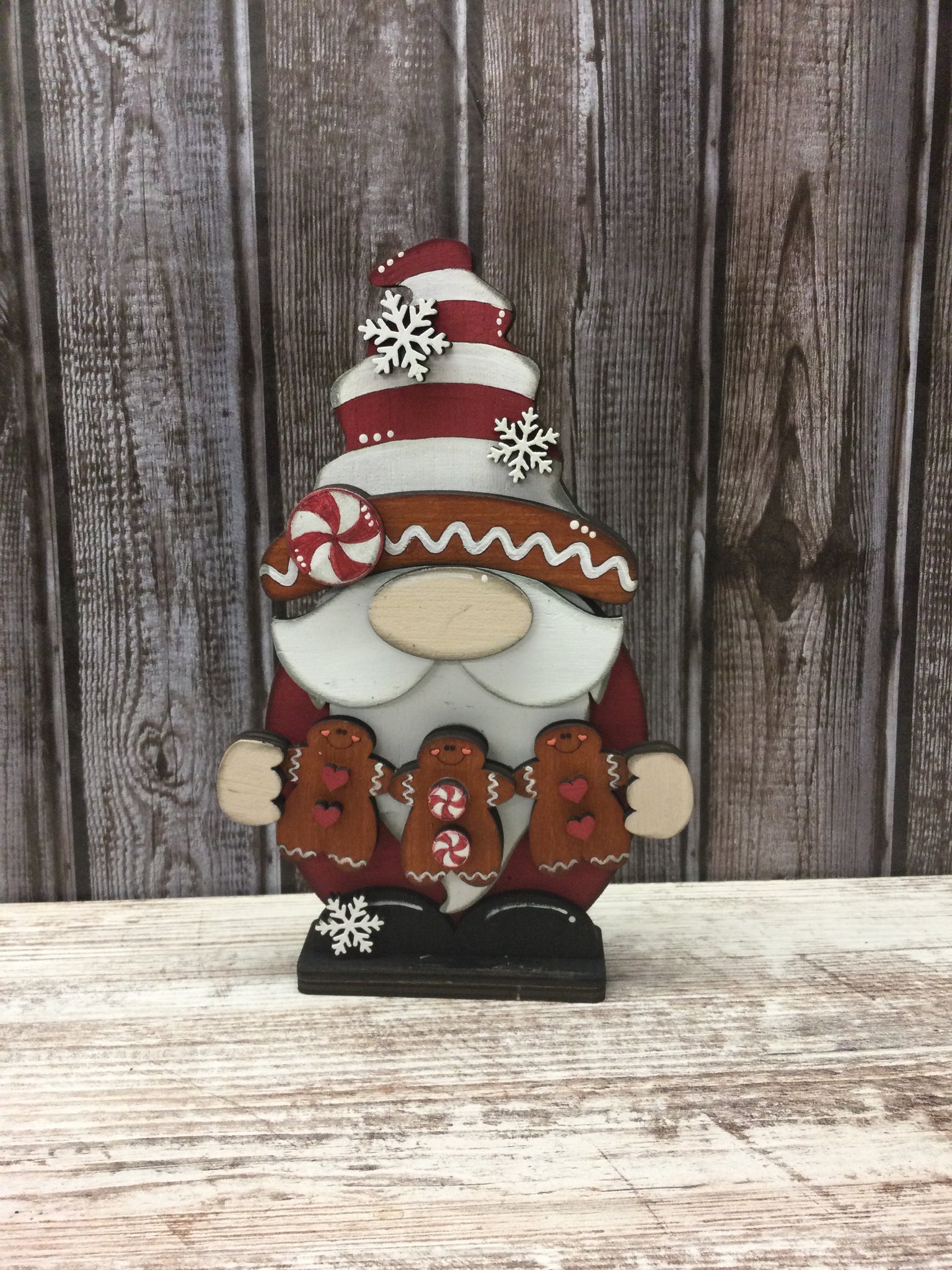 This gingerbread gnome shelf sitter is the perfect addition to your holiday decor. Crafted from wood and featuring a unique 3D design, the 8" tall x 5" wide gnome will bring the fun of gingerbread to your home. This kit comes with wood only, no paint, no glue or brushes provided.