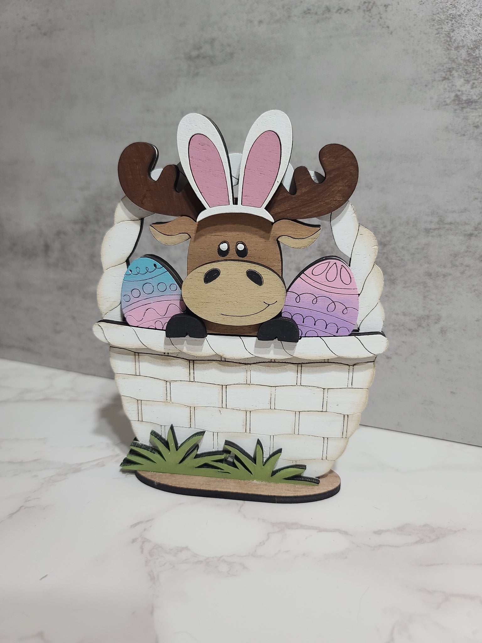 This disguised moose is wearing his Easter bunny ears and is peeking out of an Easter basket. This kit is for wood cutouts only, no other supplies are included. Measures 7 x 5 1/2