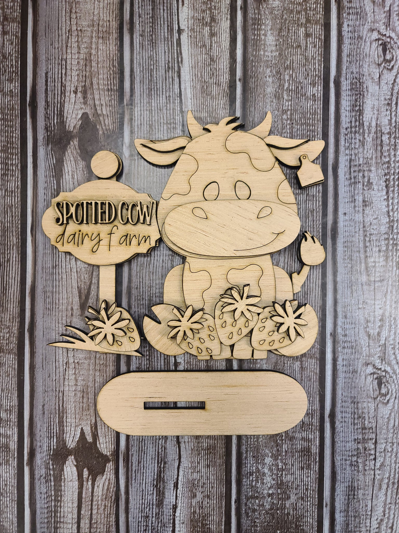 Bring a touch of rustic charm to your home with this adorableSpotted Cow Dairy Farm Shelf Sitter! Crafted from high-quality laser cut wood, this 8.5" x 7" sign features a whimsical spotted cow design, paired with sweet, vibrant strawberries for a fresh farmhouse look.