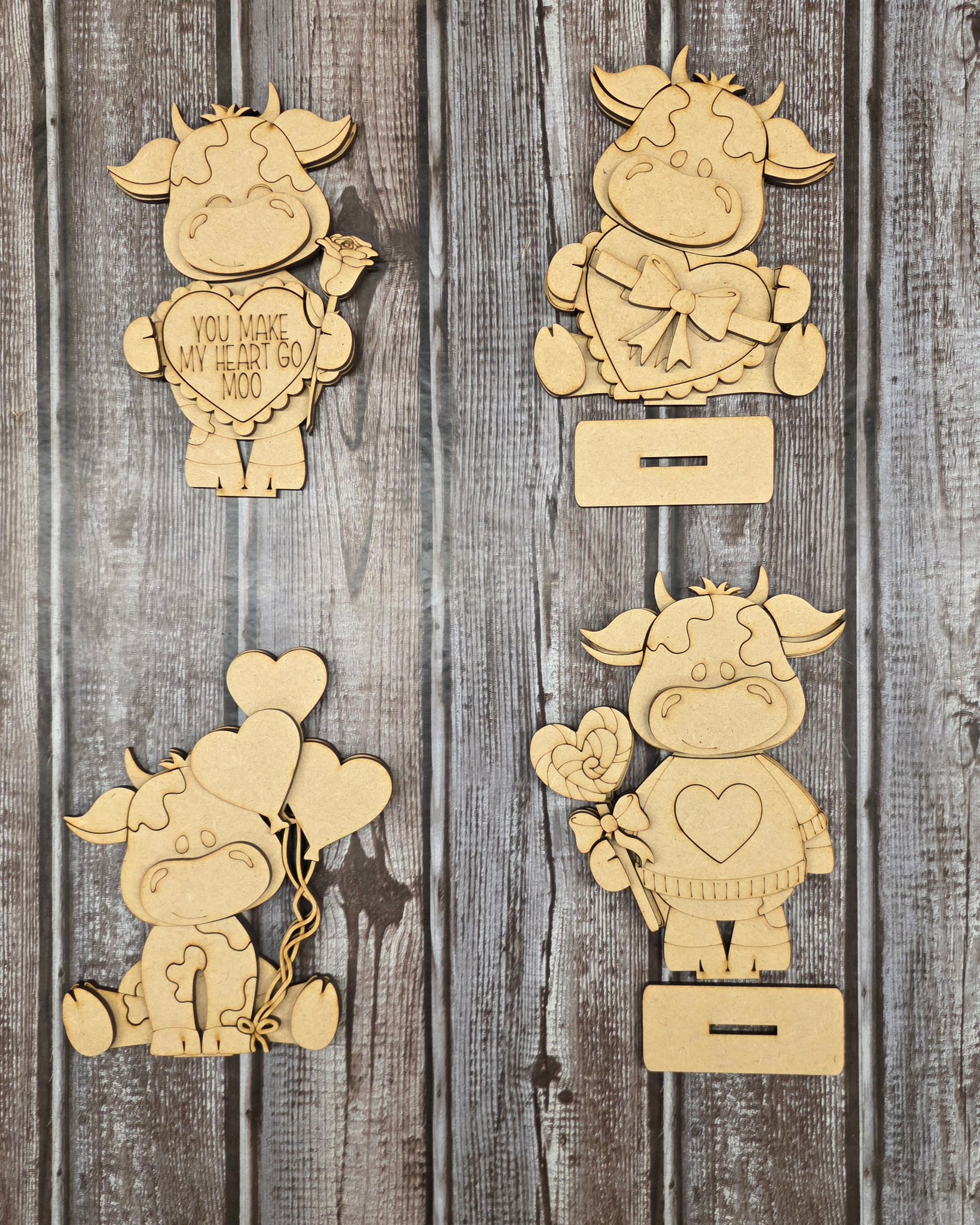 Set of 4 valentines dairy cows.  Smallest Measures 4 x 4 1/2 and the others are 5 1/2 x 4