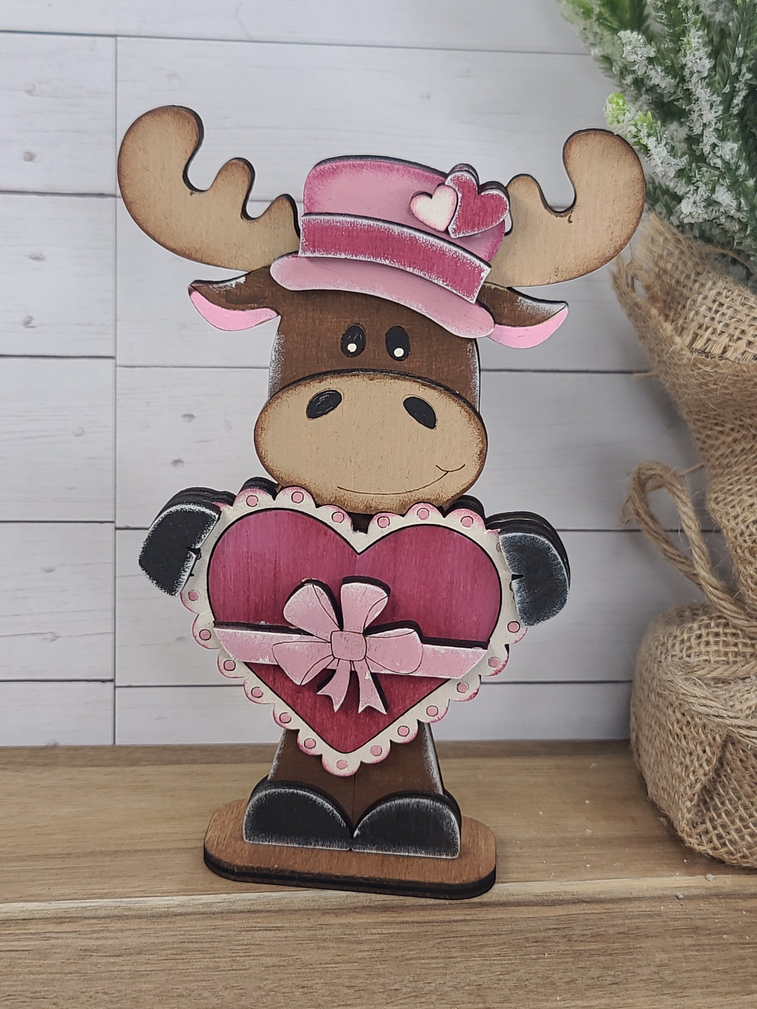 This adorable moose is ready to deliver his box of chocolates.  A cute piece to add to your value decor.  Great for a shelf, window or tiered tray.  Kit is wood cutouts only!  Measures 7 tall x 4 1/2 wide